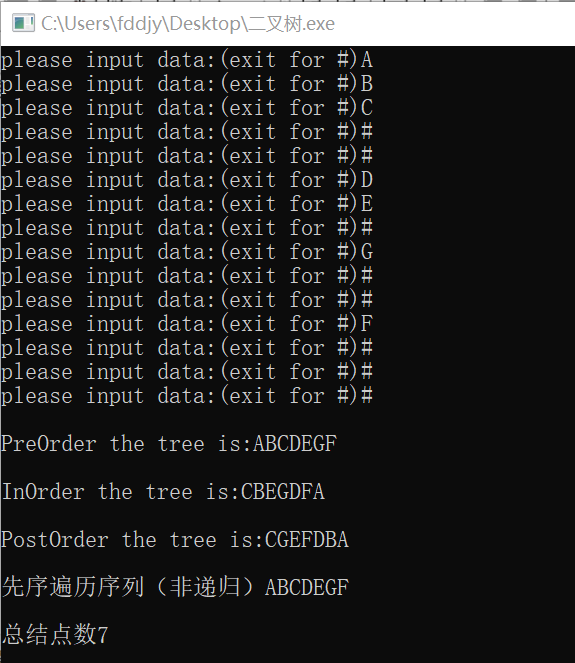 2、在上题中补充求二叉树中求结点总数算法(提示:可在某种遍历过程中统计遍历的结点数),并在主函数中补充相应的调用验证正确性。