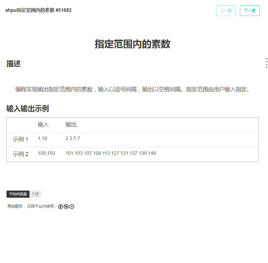 1)计算并输出指定范围内的素数