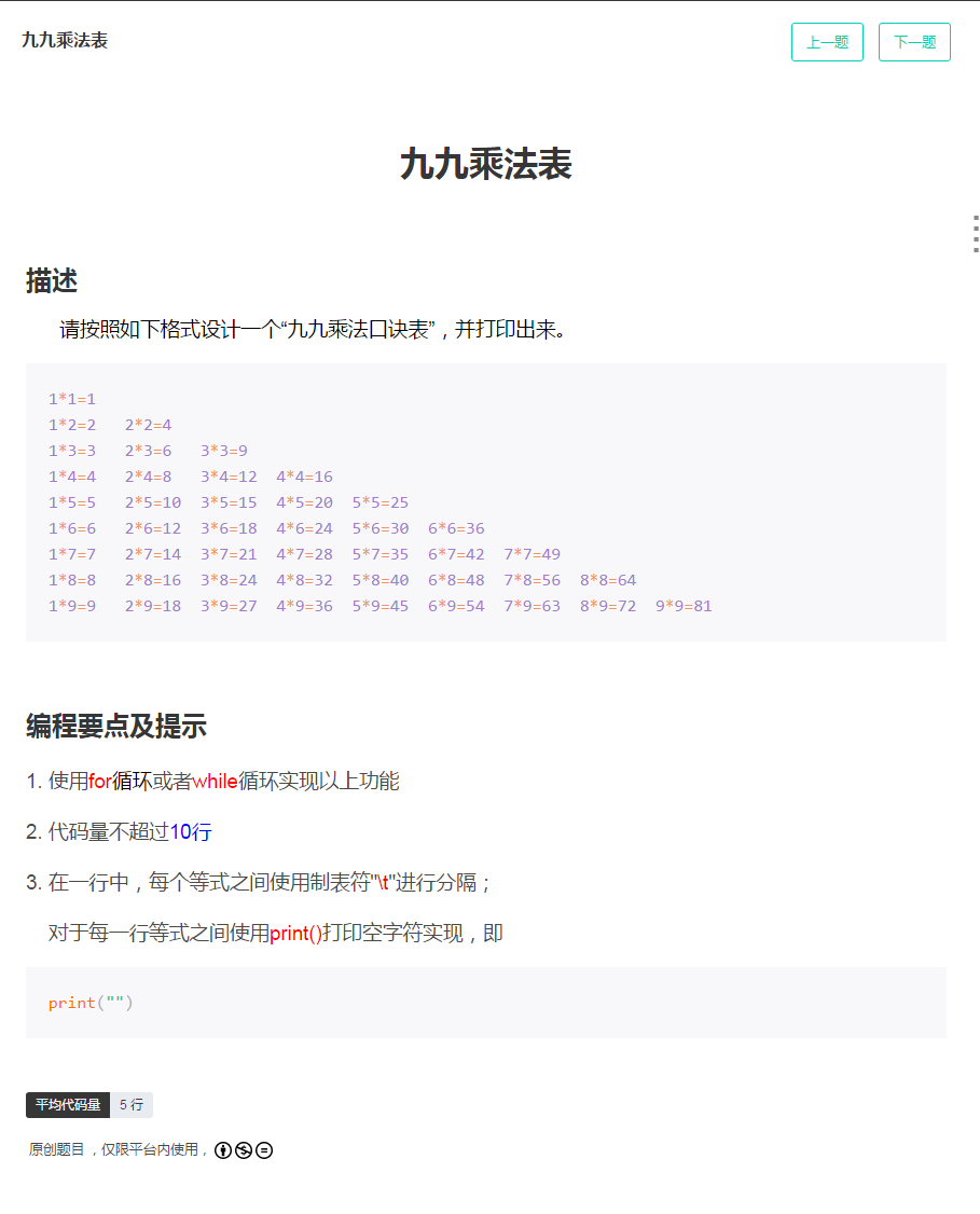 请按照如下格式设计一个“九九乘法口诀表”,并打印出来。
