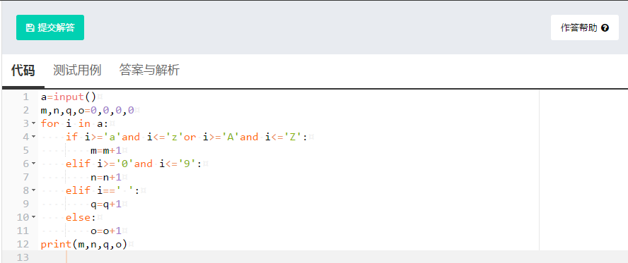 输出:按照顺序输出字母,数字,空格,及其他字符的个数,个数以空格分隔