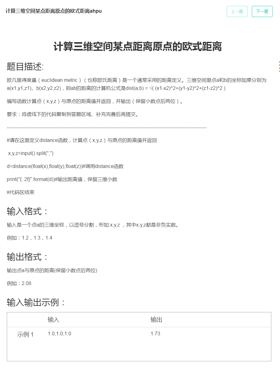 题目一 、计算三维空间某点距离原点的欧式距离