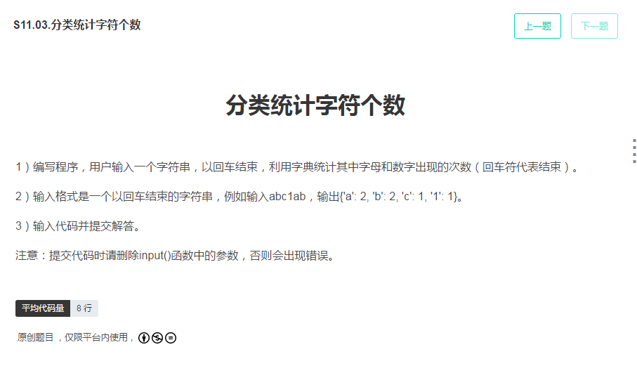 2)输入格式是一个以回车结束的字符串,例如输入abc1ab,输出{'a': 2, 'b': 2, 'c': 1, '1': 1}。