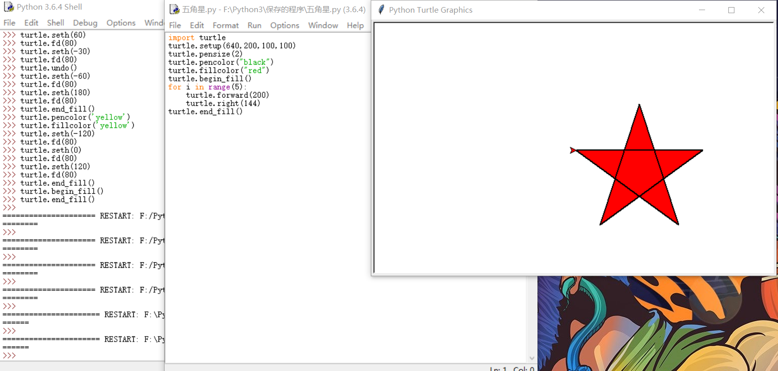 1 import turtle 2 turtle.pensize(2) 3 turtle.pencolor("black") 4 turtle.fillcolor("red") 5 turtle.begin_fill() 6 for i in range(5): 7 turtle.forward(200) 8 turtle.right(144) 9 turtle.end_fill()