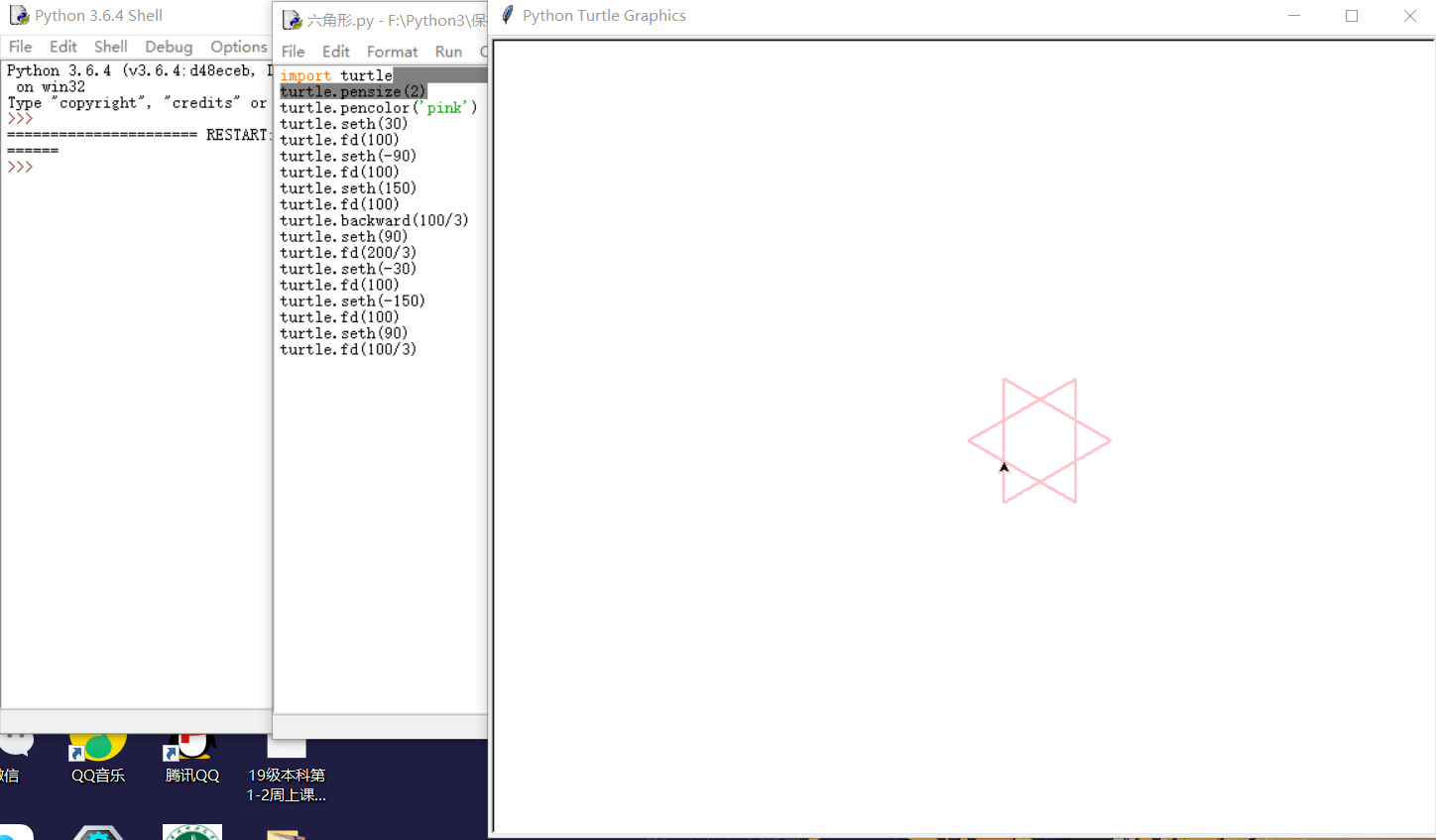 1 import turtle 2 turtle.pensize(2) 3 turtle.pencolor('pink') 4 turtle.seth(30) 5 turtle.fd(100) 6 turtle.seth(-90) 7 turtle.fd(100) 8 turtle.seth(150) 9 turtle.fd(100) 10 turtle.backward(100/3) 11 turtle.seth(90) 12 turtle.fd(200/3) 13 turtle.seth(-30) 14 turtle.fd(100) 15 turtle.seth(-150) 16 turtle.fd(100) 17 turtle.seth(90) 18 turtle.fd(100/3)