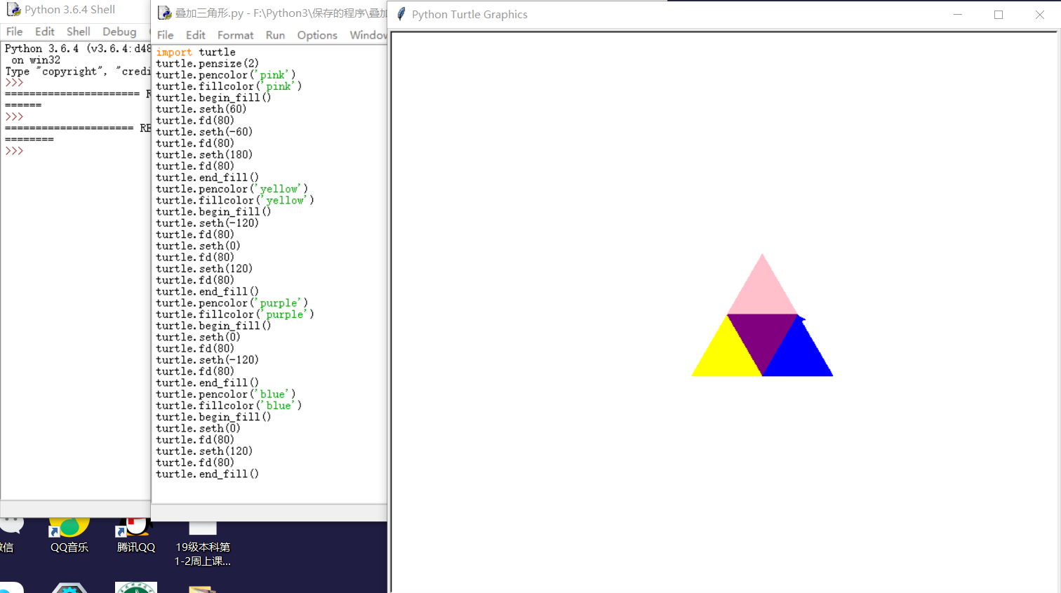 1 import turtle 2 turtle.pensize(2) 3 turtle.pencolor('pink') 4 turtle.fillcolor('pink') 5 turtle.begin_fill() 6 turtle.seth(60) 7 turtle.fd(80) 8 turtle.seth(-60) 9 turtle.fd(80) 10 turtle.seth(180) 11 turtle.fd(80) 12 turtle.end_fill() 13 turtle.pencolor('yellow') 14 turtle.fillcolor('yellow') 15 turtle.begin_fill() 16 turtle.seth(-120) 17 turtle.fd(80) 18 turtle.seth(0) 19 turtle.fd(80) 20 turtle.seth(120) 21 turtle.fd(80) 22 turtle.end_fill() 23 turtle.pencolor('purple') 24 turtle.fillcolor('purple') 25 turtle.begin_fill() 26 turtle.seth(0) 27 turtle.fd(80) 28 turtle.seth(-120) 29 turtle.fd(80) 30 turtle.end_fill() 31 turtle.pencolor('blue') 32 turtle.fillcolor('blue') 33 turtle.begin_fill() 34 turtle.seth(0) 35 turtle.fd(80) 36 turtle.seth(120) 37 turtle.fd(80) 38 turtle.end_fill()