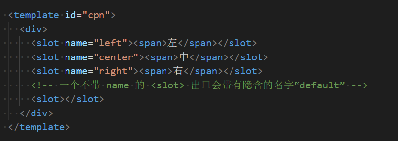 当需要多个插槽时,为了区别不同的插槽,需要给每个插槽一个名字,<slot> 元素有一个特殊的属性name,没有加name属性的插槽是默认插槽(默认name值为default)。