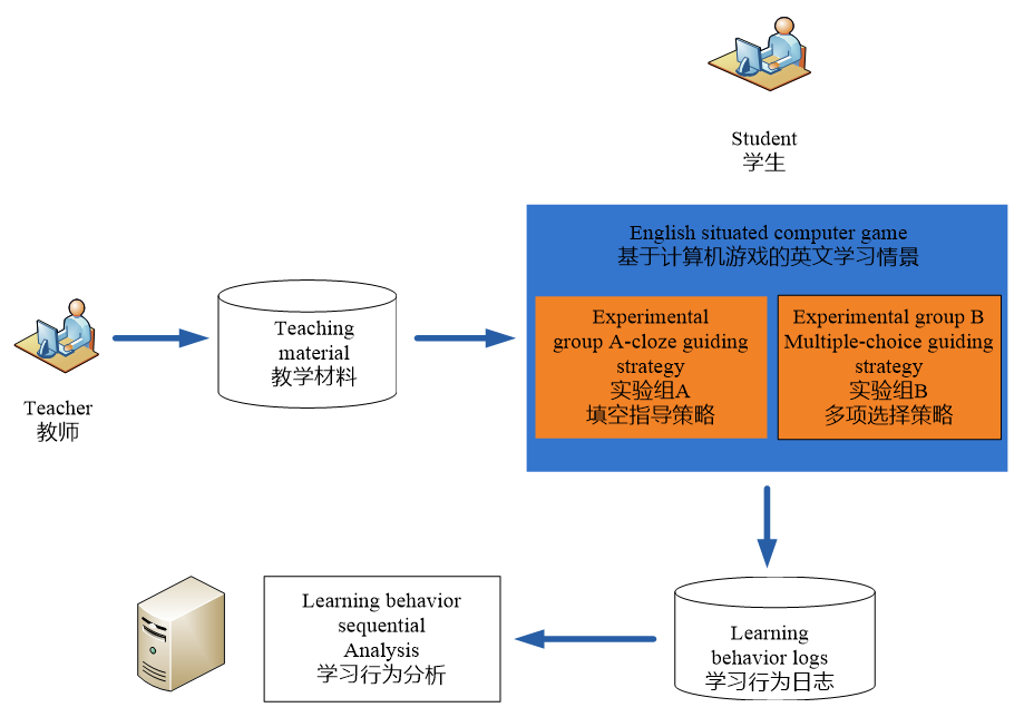 在学习活动中,实验组A的学生用英语情境计算机游戏学习完形填空指导策略,为学习任务提供了较少的线索,因为测试项目设计,所以学生需要探索,以找到问题的答案, 也就是说,他们需要观察游戏的上下文,如超市里出售的商品,以充分理解单词的用法。 另一方面,B实验小组的学生用英语情境计算机游戏学习多选择指导策略,为学习任务中提出的问题提供了一套可能的答案,因此学生在寻找答案时可以更多地关注候选解决方案。 在游戏过程中,游戏自动记录学生的学习行为,然后用于以后的行为模式分析。