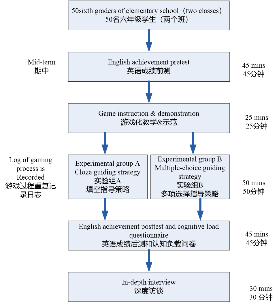 一个班的学生被分配到实验组A,另一个是实验组B。 在学习活动之前,学生参加了前测。 然后,他们被指示玩游戏,并在游戏场景中演示词汇,为他们提供必要的先验知识。 每个学生配备一台电脑,探索学习内容50min。 游戏中嵌入的词汇是以发音的功能设计的,这样学生每次在上下文中学习一个新单词时都会听到这个词,以加强他们的记忆。本研究的总体程序如图所示。