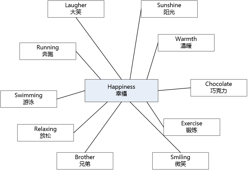 思维导图是一种发散思维工具。 它可以应用于头脑风暴和与某物的关联。 托尼·布赞曾经做过一个关于“幸福”的十个术语的头脑风暴的实验,如下图所示。 这种方法被称为“脑流”。 结果表明,每个人对幸福都有不同的术语,这意味着每个人对一个特定的主题都有不同的联想。 此外,在不同的主题中也发生了同样的结果。 很少有人用同样的术语有同样的联系。 因此,思维图可以帮助人们促进智力头脑风暴和联想。