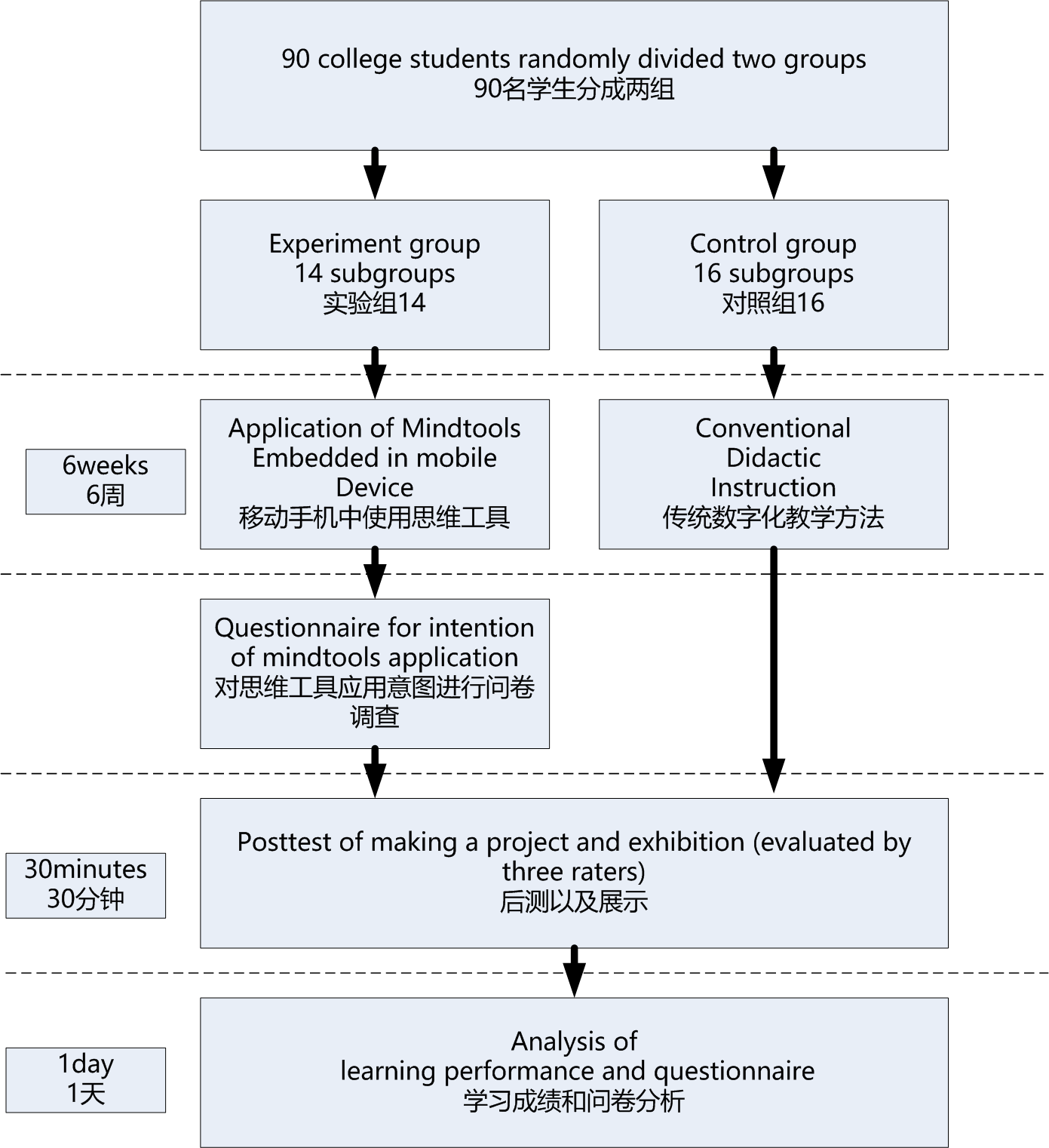 研究的实验过程如图所示。 这项研究的主题被称为“商业规划和建议实践”,学生需要了解如何通过协作学习策略制定商业计划和建议。 实验组采用移动设备中嵌入的Mindtools进行,对照组采用常规教学方法,在六周内进行。 在学习活动之后,学生必须通过阐明他们对后测的想法来制定商业计划和建议。 学习过程中,在实验组中,手机被用作移动设备,其中思维映射软件、无思维空间版本和简单无思维版本都嵌入到设备中。