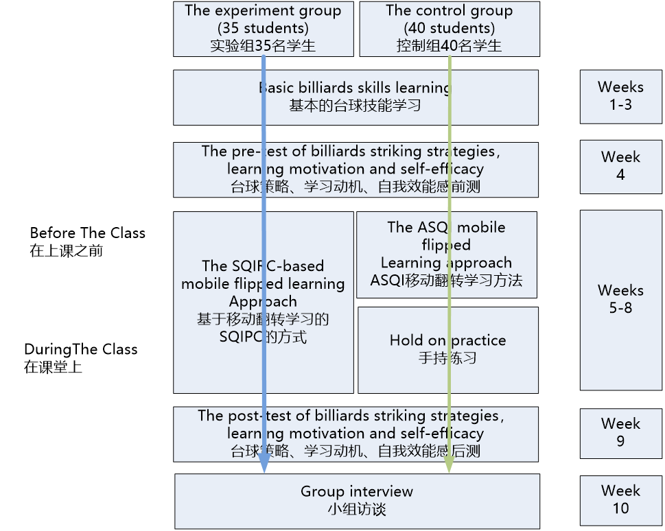 为了考察基于SQIRC的移动翻转学习的好处,采用准实验设计方法在学生台球打击策略、自我效能、学习动机和学习感知等方面与传统的移动翻转学习进行了比较。因此,在研究提出的问题如下: