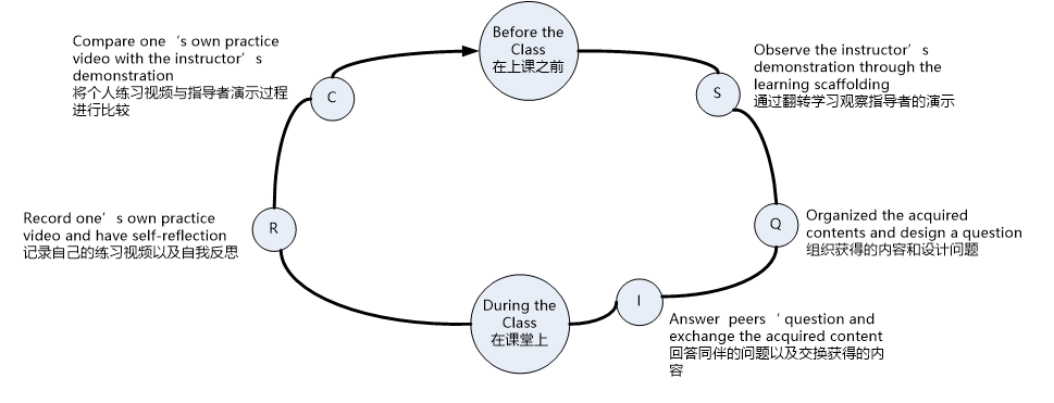 因此,基于认知学徒教育理论和反思实践,本研究提出了基于“脚手架、提问、交互、反思和比较”(SQIRC)的移动翻转学习。 在上课前,教师将提供脚手架,引导学生在观看教学视频时掌握观察要点。 然后,学生通过提出问题来组织教学视频中传达的关键概念。 此外,回答同龄人的问题可以增强同龄人之间的互动和与同龄人的交流,建立一个学习社区,并共同构建知识。在课堂上,一个学生进行动手实践,而同桌的同伴则利用移动设备协助录制实践视频。 一些研究表明,使学生能够观察他们的实践视频并反思他们的表现将有助于提高学习成绩和运动技能学习的动机。 最后,要求学生将他们的练习视频与老师的演示进行比较,以不断修改他们的表现。 当学生确定自己的行为接近标准时,他们可以上传和提交他们的视频供老师审阅并提供反馈和指导。 这种将自我反思和评价引入翻转学习的策略已被几位学者证明在促进学生的学习参与以及提高学生的自我效能感方面具有巨大的潜力。 该模式引导学生进行高阶认知思维活动,以促进学习成绩和自我效能感的提高。
