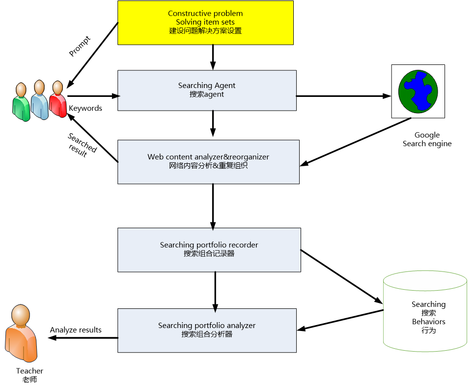(Chu et al., 2010; Hwang, Tsai et al., 2008; Panjaburee et al., 2010),开发了基于web的搜索行为分析系统,协助教师追踪和分析特定问题的信息搜索行为。为了通过元分析器有效地进行解决问题或搜索过程,给出了几个建设性的便于查询的问题,以方便学习者在线搜索有关相关学习单元的信息。每个问题都需要通过适当的关键字采用、信息选择、摘要和集成的过程来正确地回答,如图所示。学生的搜索行为,包括所使用的关键字、所浏览的页面、所浏览的网页的时间和用户上的行为网络等,完全记录在服务器中进行进一步分析,这对教育工作者相应调整他们的教学策略很有用。-------用以前的系统,不是本次开发的。