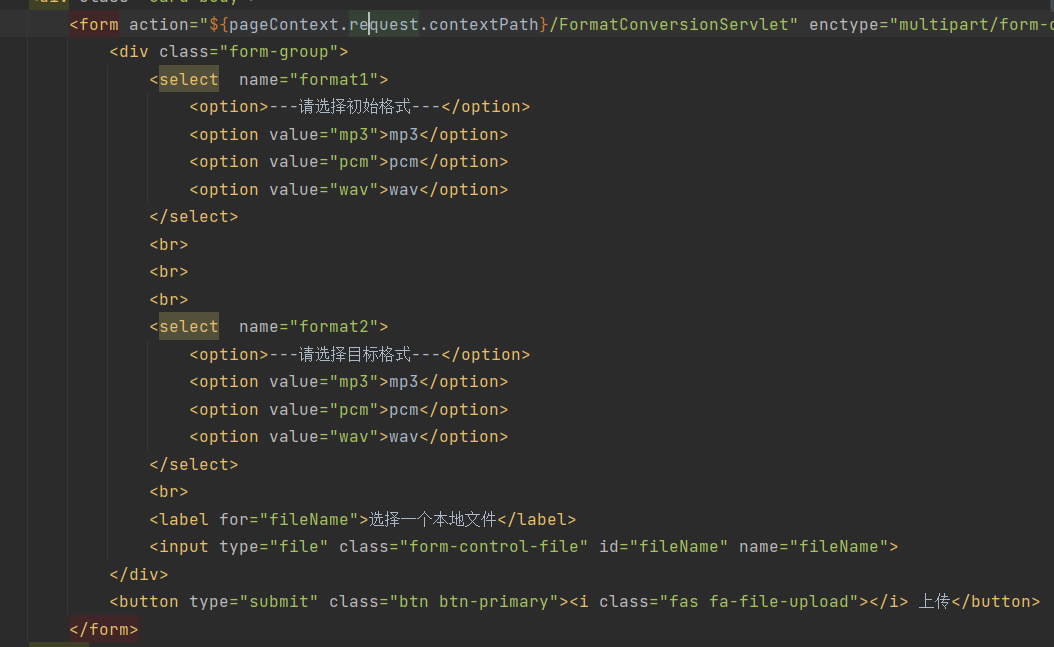 并上传文件实现格式转换。暂时没有完成mp3-pcm-wav之间的随意转换。web页面中,无法判断上传的文件格式与所选中的格式是否一致