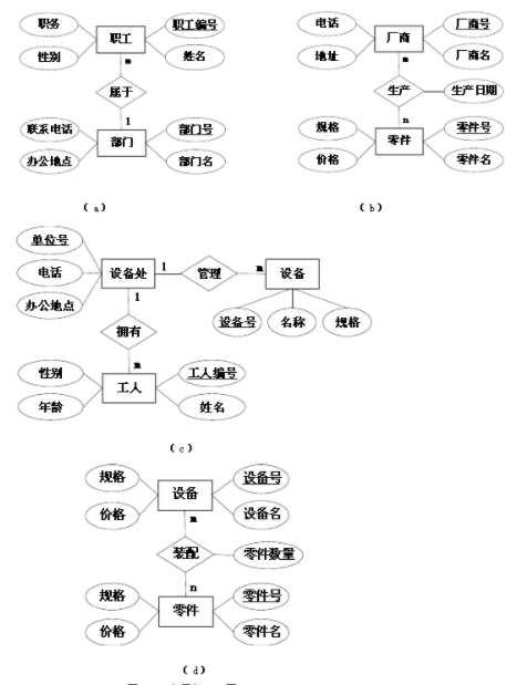 ② 设备处可合并到部门实体中,因设备处也是一个部门。可在实现时增加约束:只有设备处才能管理设备。 ③ 合并后的设备实体属性是图(c)和(d)中设备属性的并集。