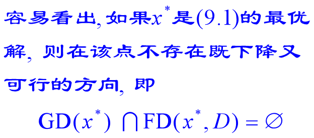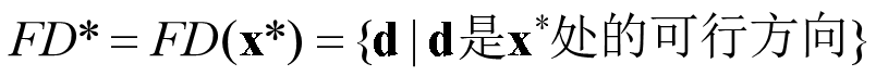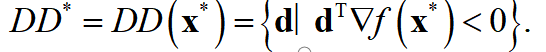 在某些条件下,LD^∗=FD^∗。任何一个保证LD^∗=FD^∗成立的条件称为约束限制条件( constraint qualification). 在预备知识中谈过,对于目标函数f(x),若沿方向d的一阶方向导数小于0,则该方向是下降方向,记