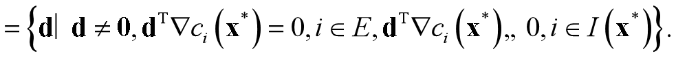 定理4.2.5 若在约束问题(4. 1)的局部解x^∗处下述两条件之一成立: (1) 是线性函数; (2) 线性无关; 则在x^∗处有FD^∗=LD^∗