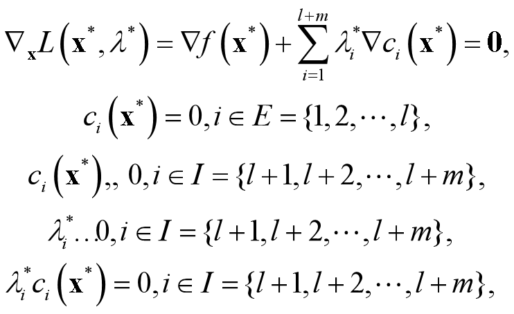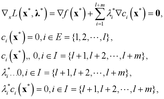 定理4.2.6 设x^∗是问题(4.1)的一个局部解, c_i(x)(i∈E∪I(x^∗))是 线性函数或 线性无关,则必存在λ^∗ ,使得K-T条件 (4.2.4)成立.