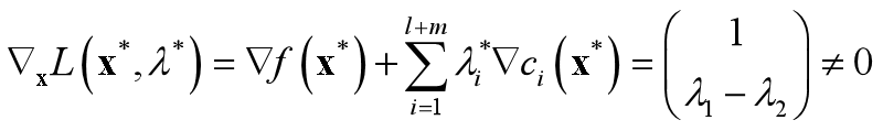 定理4.2.4 (约束问题局部解的一阶必要条件)设约束问题(4. 1)中的 f (x), ci(x)(i=1, 2, …, l+m)具有连续的一阶偏导数,若x*是约束问题(4. 1)的局部解,并且在x*处约束限制条件成立(即LD*=FD*),则存在λ^∗=(λ_1^∗,λ_2^∗,…,λ_l+m^∗) ^T, 使得