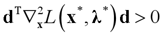 定理4.3.1(约束问题局部解的二阶充分条件) 考虑约束问题(4.1),设f(x),c_i(x)(i∈E∪I)具有连续的二阶偏导数.若存在x^∗满足下列条件: (1) K-T条件成立, 即存在 , 使得