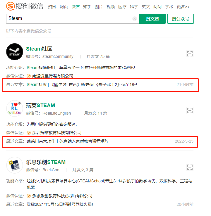 - 于是找了好多资料如何得到最新的公众号文章。找到一个搜搜搜索引擎,腾讯自家的,里面有一个搜索公众号的功能。Steam的相关微信公众号 – 搜狗微信搜索 (sogou.com)