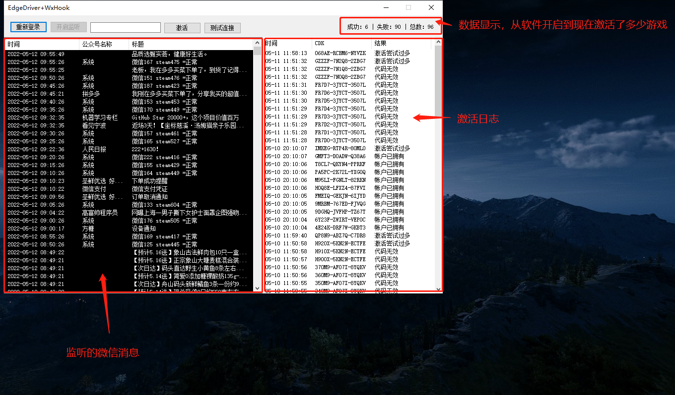 - 监听微信HOOK,当有新文章发布的时候,解析文章中的cdk。