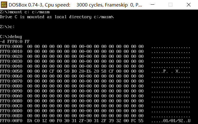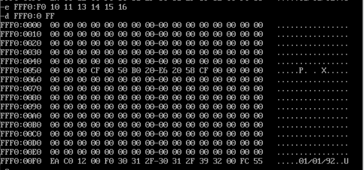 PC机主板上的ROM中有一个生产时期,在内存FFF00H ~ FFFFFH的某几个单元中,请找到这个生产时期,并试图修改它。