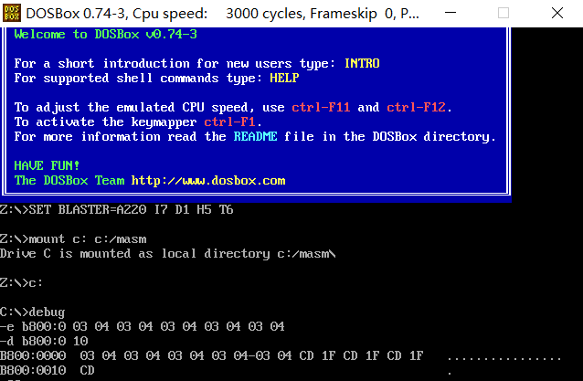 -e b800:0 03 04 03 04 03 04 03 04 03 04 从b800:0开始的内存单元开始,依次写入十六进制数据04 03,重复写5次。