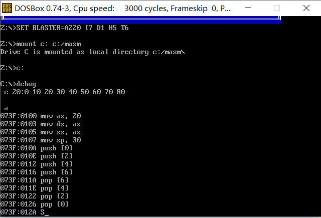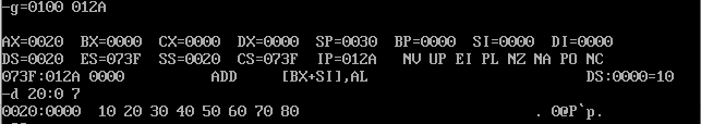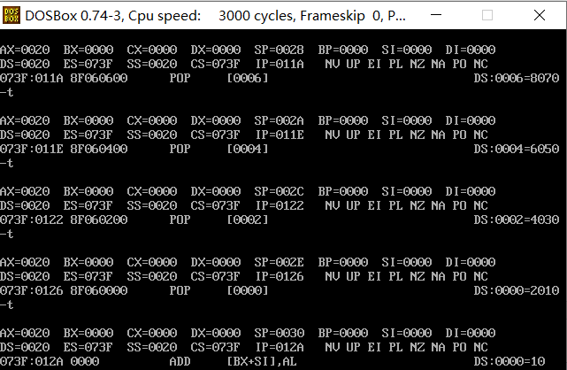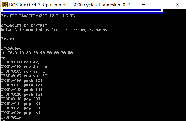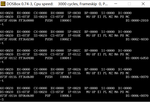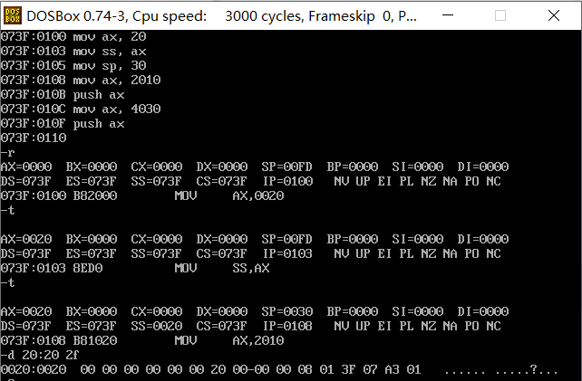 问题2:根据汇编指令,前三条指令执行后,00220H ~ 0022fH被设置为栈空间。并且,初始时,已通过f命令将初始栈空间全部填充为0。观察单步调试时,