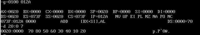 答:由实验结果可以看出多出的08 01应该是偏移地址,而3F 07是段地址,也就是说t命令为单步执行,执行后应该存在某种中断程序,而段地址和偏移地址就保存在了内存中。