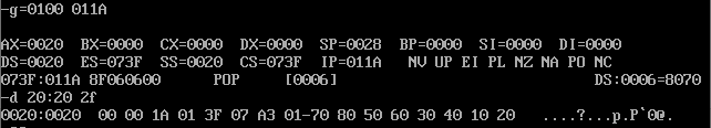 (3) pop [0] 指令执行结束后,使用d命令 d 20:0 7 查看此时数据空间内的数据是否有变化。