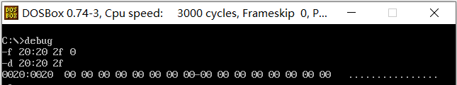 先使用f命令,把00220H ~ 0022fH区间的16个字节内存单元值全部修改为0。并使用d命令查看确认。