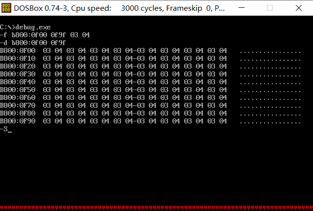 把内存单元区间b800:0f00 ~ b800:0f9f连续160个字节,依次重复填充十六进制数据03 04。