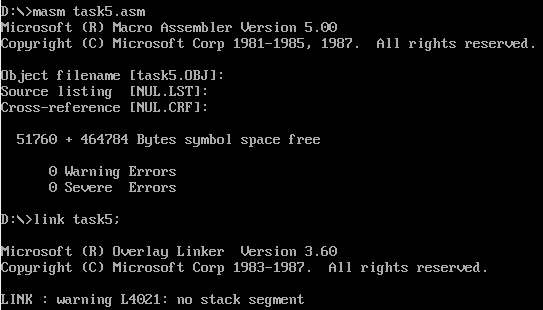 使用masm、link,汇编、链接,得到可执行文件task5.exe。运行程序。结合程序运行结果,理解程序功能。