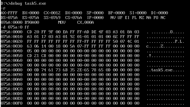 在debug中,使用d命令,查看task5.exe的程序段前缀,观察这256个字节的内容,验证前两个字节是否是CD 20。