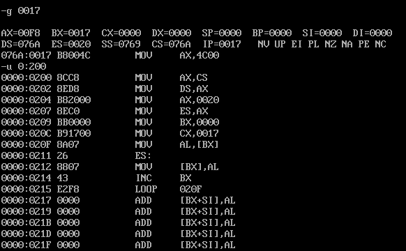 (2) 在debug中调试,使用g命令将程序执行到 loop s 之后、 mov ax, 4c00h 之前,然后,使用u命令