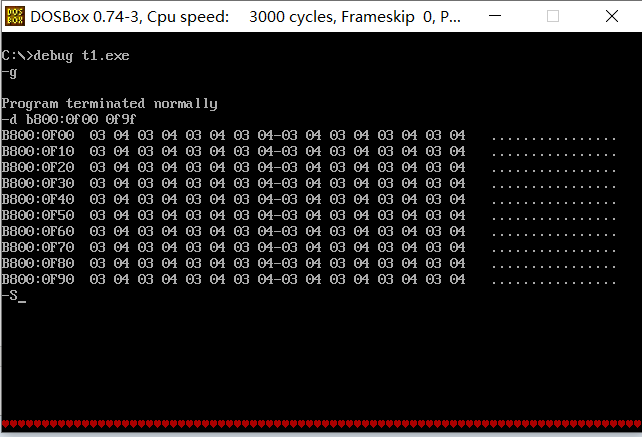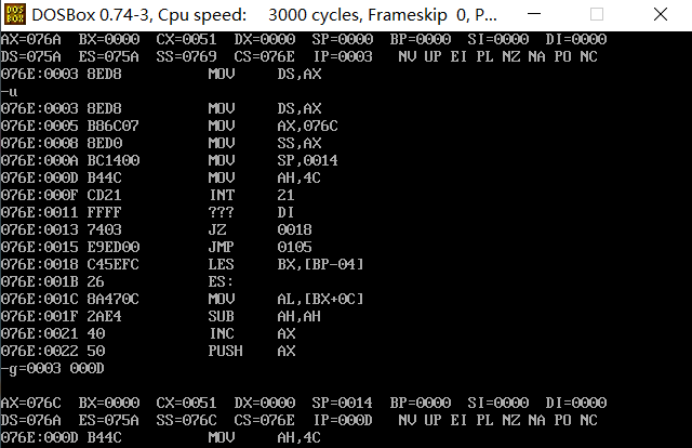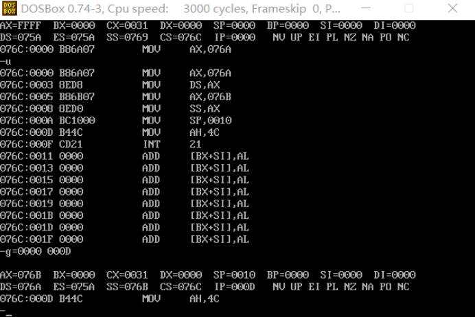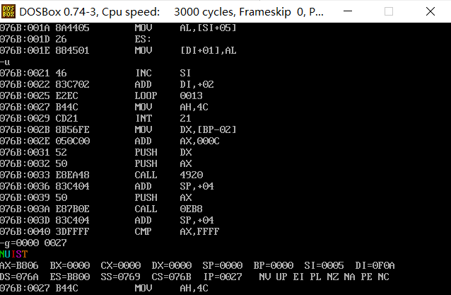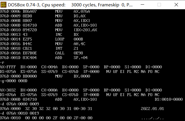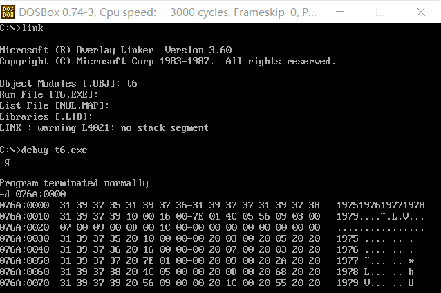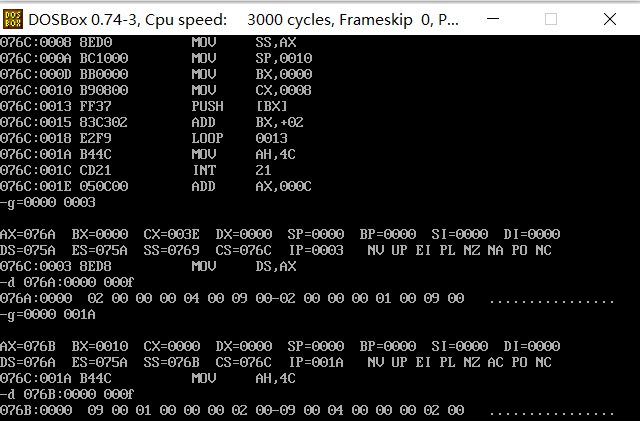 ② 汇编、连接后,在debug中加载、调试程序。灵活、合理使用u命令、g命令、d命令,显示刚开始逻