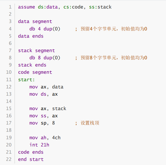 ② 假设程序加载后,code段的段地址是X,则,data段的段地址是_X-4___, stack的段地址是_X-2___。