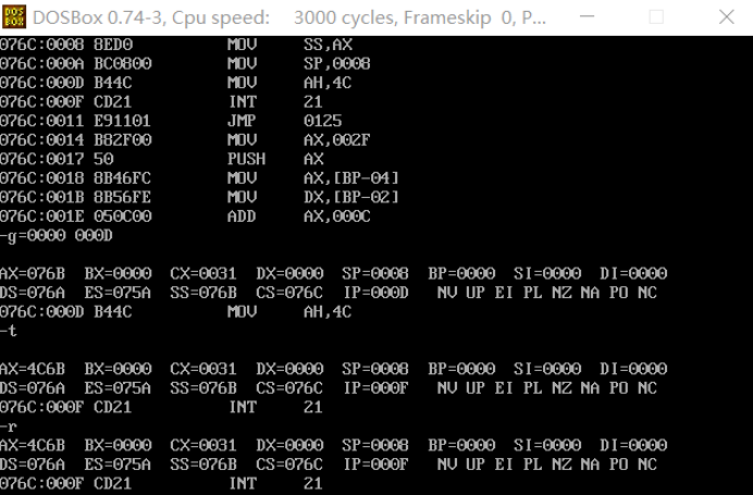 ① 在debug中将执行到line17结束、line19之前,记录此时:寄存器(DS) = __076C__, 寄存器(SS) =_076E___, 寄存器(CS) = _076A___