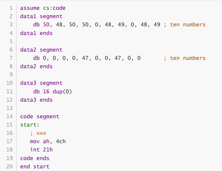 ① 编程实现把逻辑段data1和逻辑段data2的数据依次相加,结果保存到逻辑段data3中。