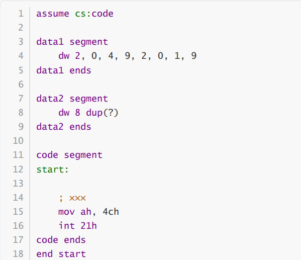① 补全程序,实现把逻辑段data1中的8个字数据逆序存储到逻辑段b中。