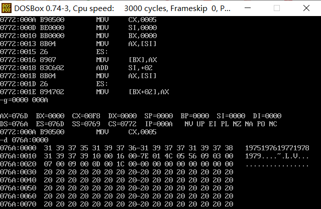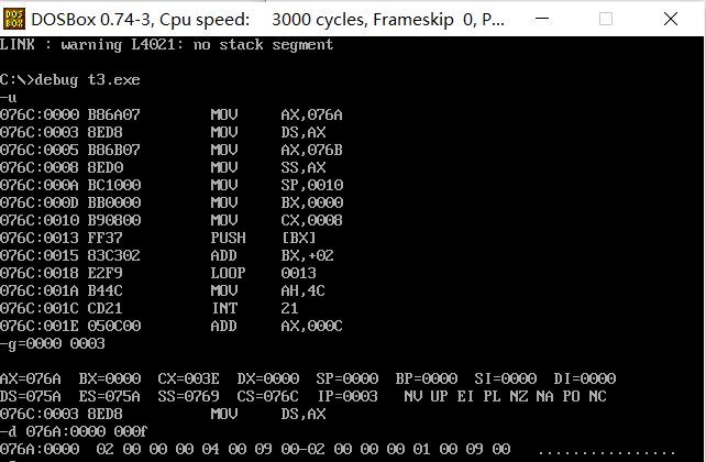 ① 在debug中将执行到line17结束、line19之前,记录此时:寄存器(DS) = __076A__, 寄存器(SS) =_076B___, 寄存器(CS) = _076C___