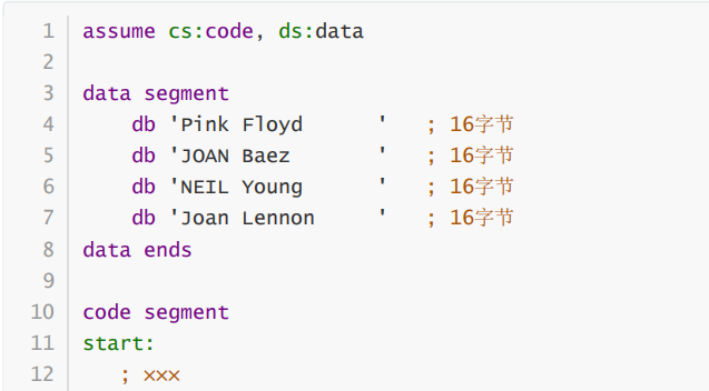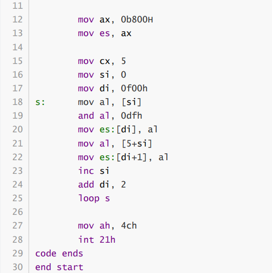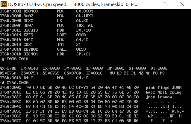 assume cs:code, ds:data data segment db 'Pink Floyd ' db 'JOAN Baez ' db 'NEIL Young ' db 'Joan Lennon ' data ends code segment start: mov ax,data mov ds,ax mov bx,0 mov cx,4 s: mov al,[bx] or al,00100000B mov [bx],al add bx,16 loop s mov ah, 4ch int 21h code ends end start