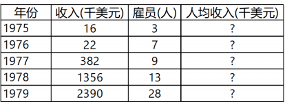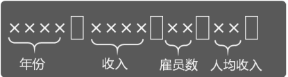 ① 补全程序,实现题目要求,把年份、收入、雇员人数、人均收入,以结构化方式写入table段中。