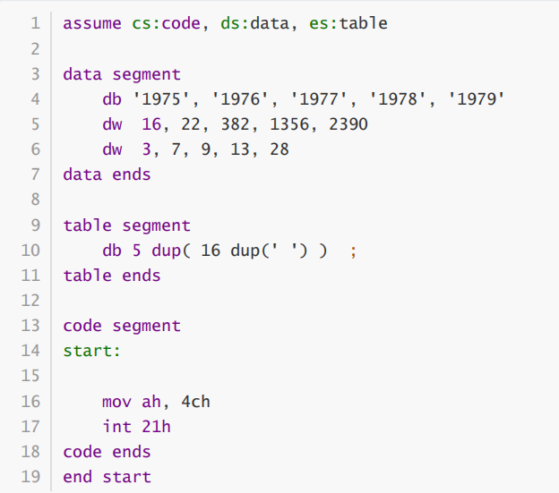 assume cs:code, ds:data, es:table