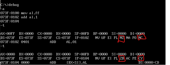 add指令对标志寄存器中的零标志位ZF(Zero Flag)、进位标志位CF(Carry Flag)均有影响。