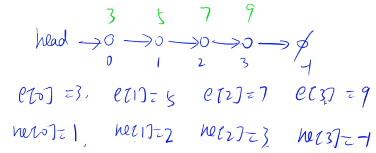 所以创建两个数组e[N],ne[N],前者存值,后者存下个节点的下标,通过下标将两个数组联系起来。
