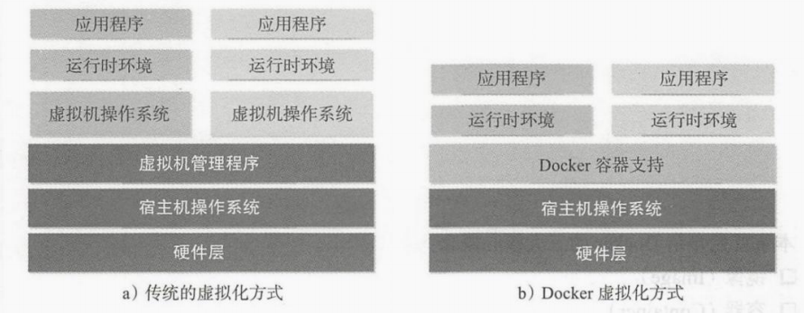 传统方式是在硬件层面实现虚拟化,需要有额外的虚拟机管理应用和虚拟机操作系统层。Docker 容器时在操作系统层面实现虚拟化,直接复用本地主机的操作系统,因此更加轻量级。