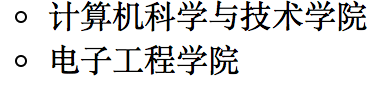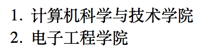 <html> <head> <title>事例</title> </head> <body> <!-- 演示有序标签 --> <ol type="1"> <!== 引号里可写1,a,i ==> <li>计算机科学与技术学院</li> <li>电子工程学院</li> </ol> </body> </html> <meta http-equiv="Content-Type" content="text/html;charset=utf-8"/>