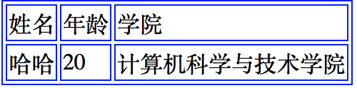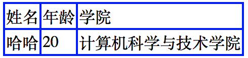 <html> <head> <title>事例</title> </head> <body> <table border="1" bordercolor="blue" cellspacing="0"> <tr> <td>姓名</td> <td>年龄</td> <td>学院</td> </tr> <tr> <td>哈哈</td> <td>20</td> <td>计算机科学与技术学院</td> </tr> </table> </body> </html> <meta http-equiv="Content-Type" content="text/html;charset=utf-8"/>